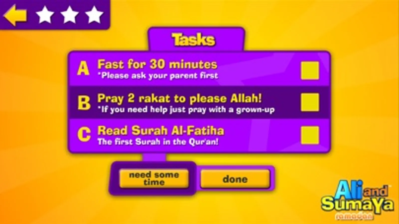 *Please note, fasting in Islam is not obligatory on a person until they reach adulthood/puberty. This App will ask your child to fast every day for a short period of time (between 30 mins and 3 hours) to practice and to join in with the spirit of Ramadan. You may advise your child to do this between meal times to make it easier for them. If you do not consent to this, please ask your child to do another good deed in its place.