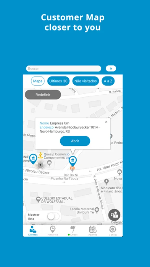 - MAP: The reports work integrated with Google Maps, marking the points visited by the sellers/representatives through Geolocation of the checkins carried out.