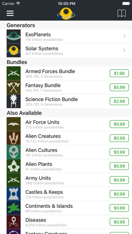 Use our powerful generator to create literally quadrillions of characters, creatures, weapons and locations! With generator topics from sci-fi to fantasy to space, we've got you covered no matter what project you’re working. A simple tap of the button will re-generate a new result, so you'll never be out of ideas again!