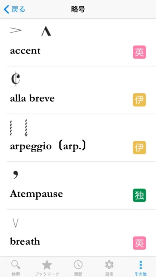 ・「巻末付録」(音名、略号、楽器、数詞)が閲覧可能になります。それぞれ、音名は五線譜上の音符を、略号は音楽記号を、楽器は楽器名を、数詞は数字をタップすることで、アルファベット表記を調べることができます。また、巻末付録に含まれているすべてのアルファベット表記は、本文検索からも調べることができます。