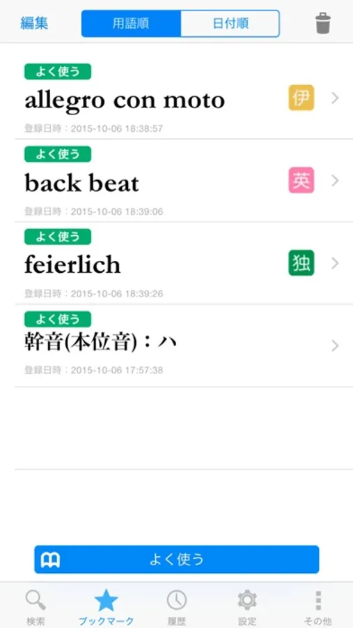 過去に検索した音楽用語の履歴を表示することができます。ついさっき調べた用語などは、再度アルファベットを入力する手間が省けます。
