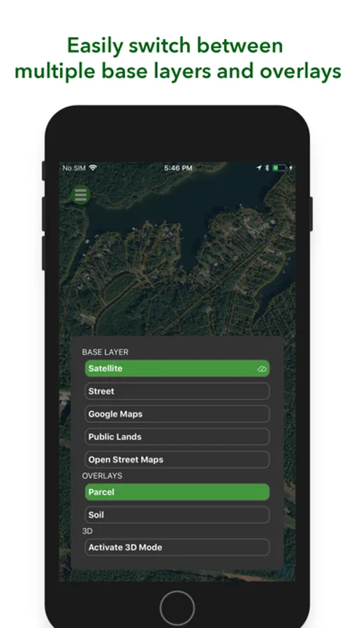 - Select from multiple base layers including Satellite, Street, Google Maps, Open Street Maps, and our proprietary Public Lands Layer. Also gain access to nationwide soil information.