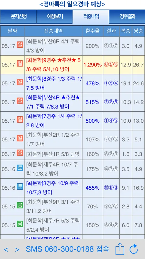 국내 최고 유명 경마 예상 전문위원들의 고배당 SMS 문자정보 서비스 경마 적중 예상 정보를 실시간으로 경주전에 빠르게 받아보실수도 있습니다.