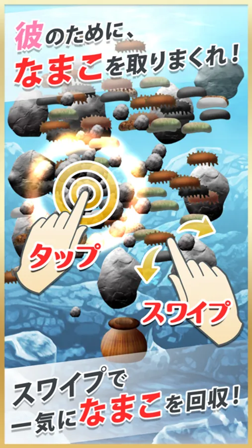 海に転がる岩をタップで破壊! 飛び散ったなまこに触れて回収しよう!