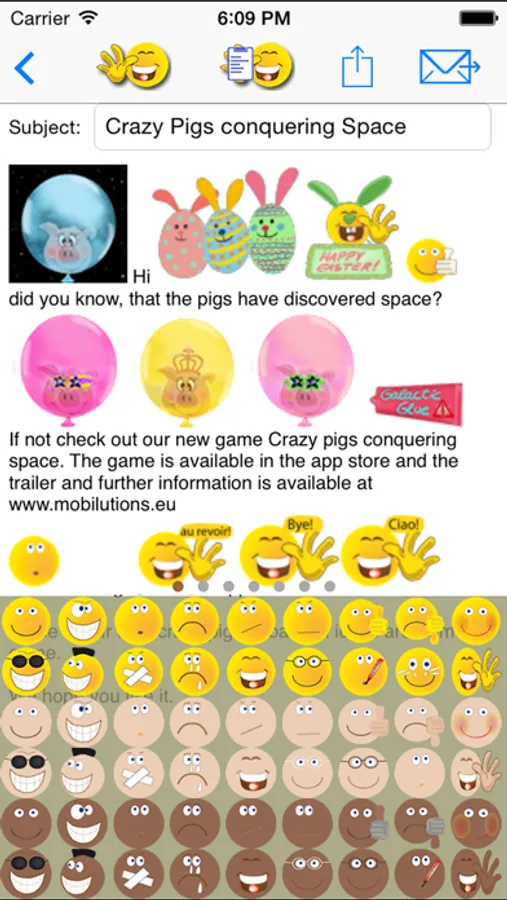 There also is an other buyable version of sMaily which comes without iAds and additionally offers a sMaily keyboard which can be used in any App that is able to support and paste images and also offers copying images to the clipboard and paste the images in any app that allow the pasting of images. The clipboard can be adjusted to support WhatsApp optimized images so that they look great in the preview and thus can perfectly used for your chats. It additionally also lets you adjust the size of smileys. You can choose between 3 different sizes. (Can be adjusted in the action menu)
