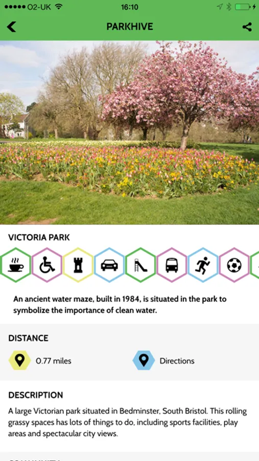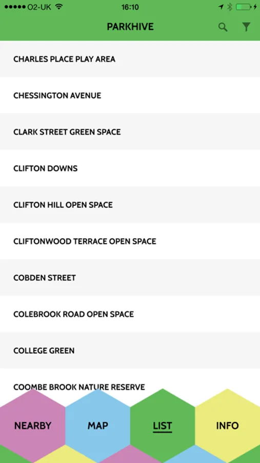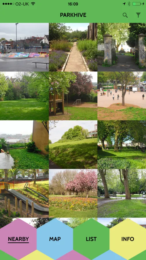 - Parkhive uses GPS to identify the parks and green spaces nearest to the user and enables searches by specific characteristic e.g ‘my nearest park/green space’ with ‘marked walking and running routes’ or a ‘children’s play area.’ It also provides information about travel to the site, facilities available to visitors and details of a wide range of characteristics including: