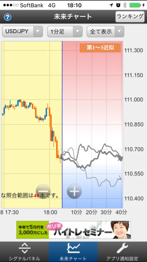 現在のチャート形状に似た過去のチャートを自動で検出し、過去の近似チャートのその後の値動きから未来の値動きを予測したチャートです。シグナルパネルの売買傾向を通貨ペアやローソク足の期間ごとに点数化したランキング表を未来チャートと合わせてチェックできます。