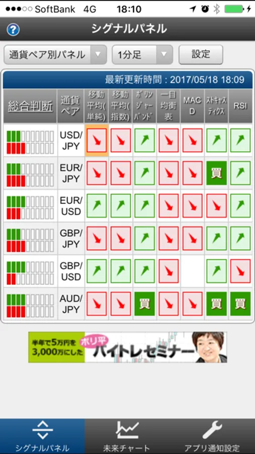 7種類のテクニカル分析による売買傾向が一覧表示され、視覚的に売買傾向を把握できます。さらに、テクニカルチャートで売買のタイミングも教えてくれます。売買シグナルによるトレード成績を分析指標・通貨ペア・足種毎に確認でき、信頼度の高いテクニカル分析を選ぶこともできます。