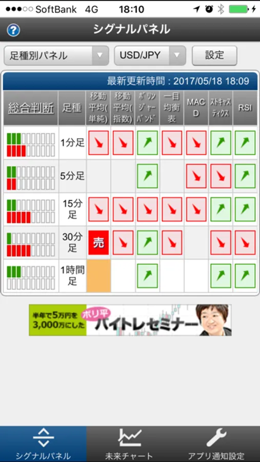 設定した条件の売買シグナルや未来チャートが発生した場合に、スマートフォンに通知される便利な機能が搭載されています(プッシュ通知機能)。