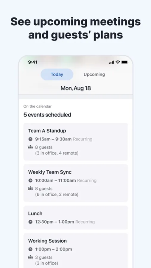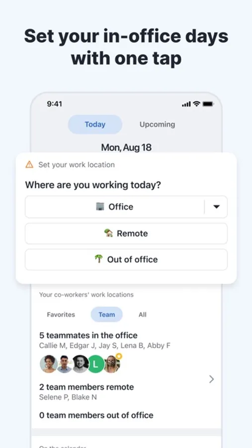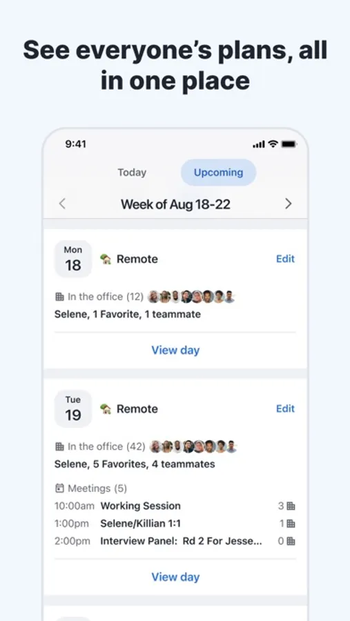 Get a look ahead at your day or week with a real-time Snapshot of who’s going in and what’s on your calendar. Make plans, shift meetings, and invite your Favorite people to join you.