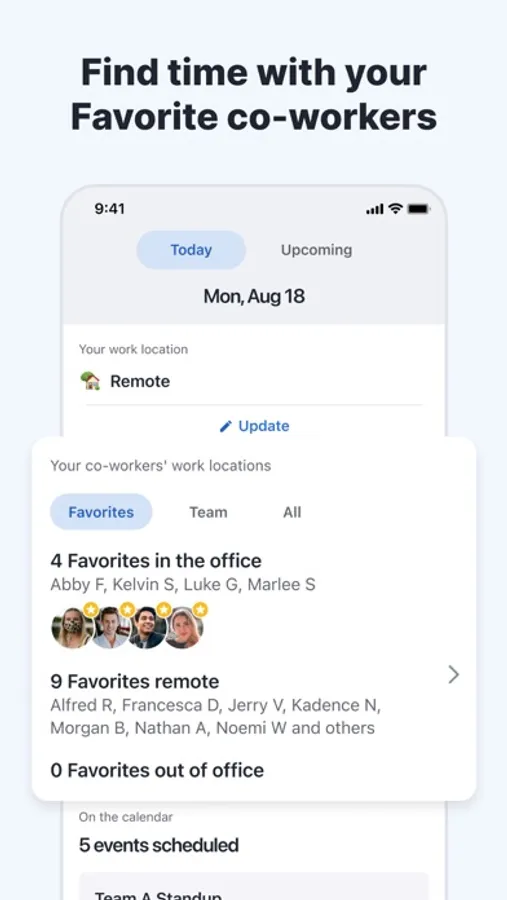 Add work friends or close collaborators to your Favorites list to see the days they're going into the office, instantly.