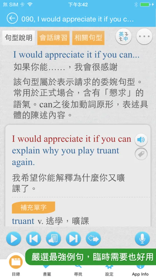 名師嚴選的好用句型,將英文句型分解念出,讓你不必看書也能學習萬用英語句型。並同時收錄全部例句和對話。邊聽邊學,大家都在用的那句話,你也能輕鬆開口說!