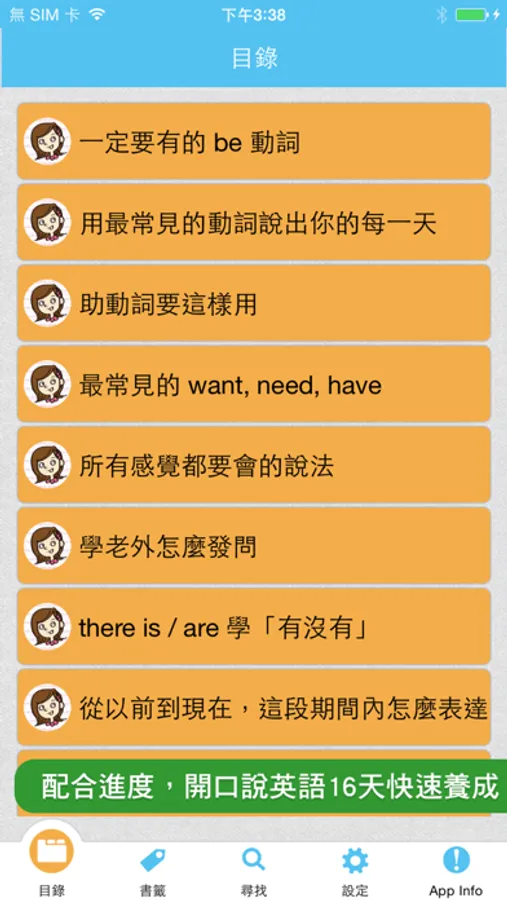 為了廣大的自學讀者,特別設計16天學習課程,讀者可以自行調整或是配合本書為您設計的學習進度,一天一個主題,16天就能將老外愛用、學英語一定要會的句型學習完成。