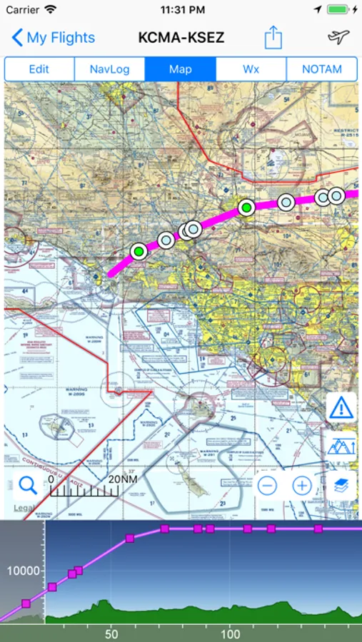 During the flight, the moving map will display the aircraft location along the route, show airports and aeronautical data details, warn you if your planned route is crossing restricted areas. A profile view is available to display terrain elevation, crossed areas and forecasted weather across the route. Airmate can also display a backup aircraft attitude indicator and flight parameters in an EFIS-like view using the device internal sensors or a supported external AHRS-capable ADS-B receiver or supported aircraft avionics. In the whole world, Synthetic Vision displaying in the EFIS-like view the ups and downs of rolling terrain ahead is available. In selected countries, Airmate can display photographic landscape on Synthetic Vision when Photo scenery option is purchased.
