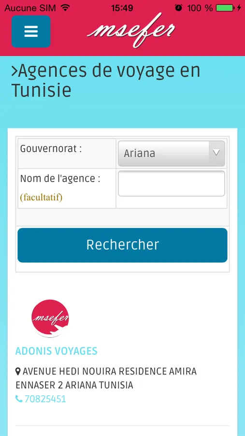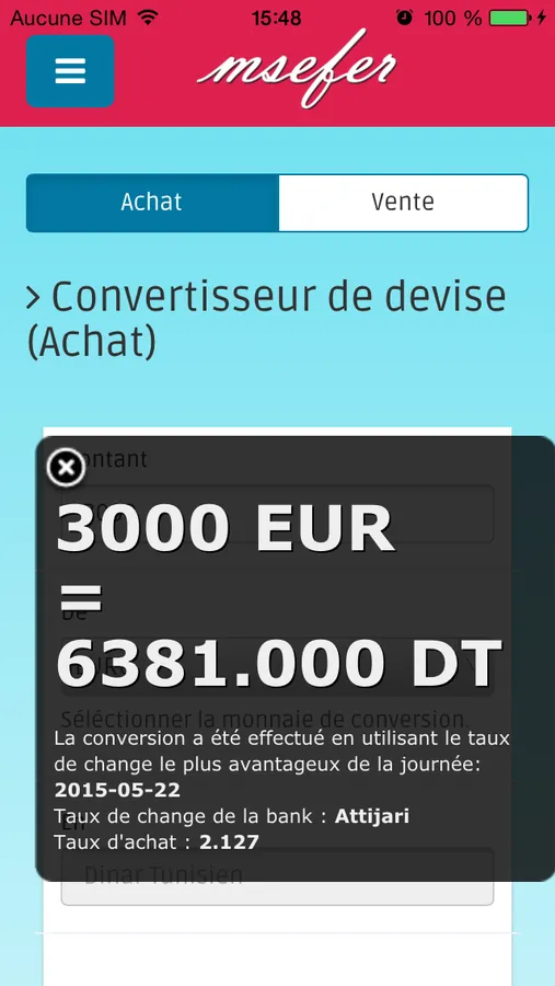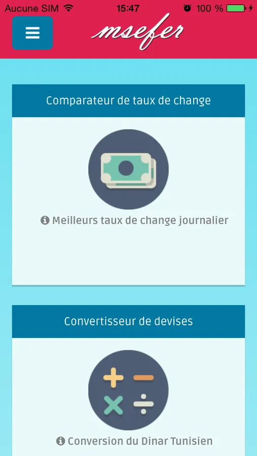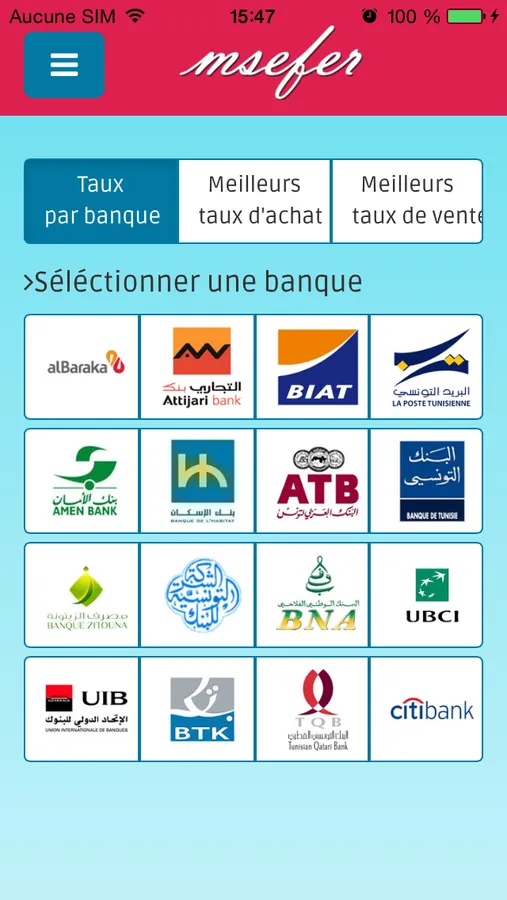 l'application "msefer" est le parfait guide du voyageur Tunisien, elle permet entre autre de consulter le meilleur taux de change journalier, de suivre le trafic aérien dans les différents aéroport en Tunisie ou pour trouver une agence de voyage.