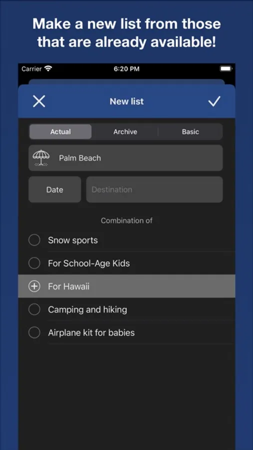 This is very convenient: first you can create your own basic lists, for example: women's clothes, beach set, photo equipment, etc.