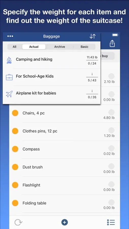 - Add weight for each item. For any list (suitcase), you can specify the "Consider weight" property. If this box is checked, then you can see the total weight of all items in the list plus the weight of the suitcase itself.