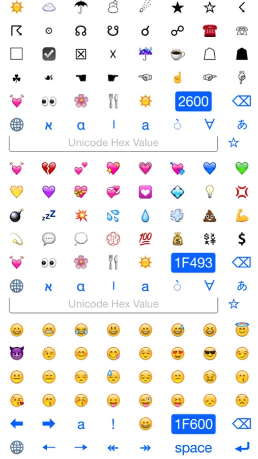 The FULL POWER of UNICODE at your fingertips. Universal input for ANY Unicode character including all alphabets, symbols and emojis using hexadecimal keypad.
