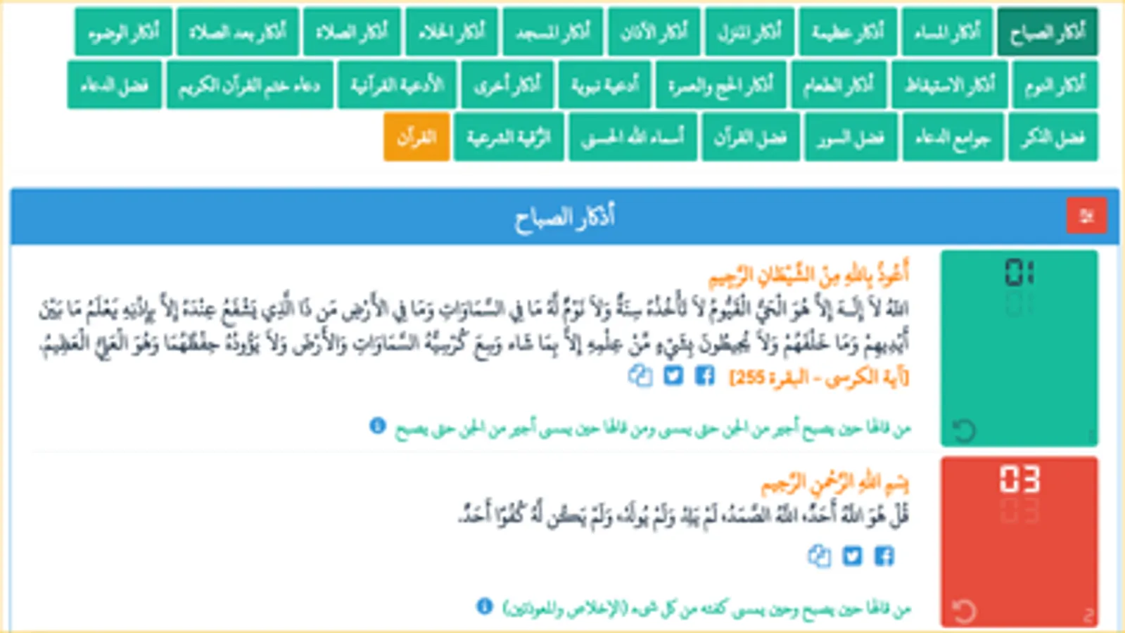 قاعدة بيانات القرآن الكريم، ترجمات القرآن الكريم، الترجمة الحرفية للقرآن، تفسير القرآن، القرآن، الحديث، أوقات الصلاة، اتجاه القبلة، شروق وغروب الشمس، اذكار الصباح والمساء اليومية، الأذكار، اذكار المسلم، اذكار الصلاة، اذكار الوضوء، اذكار النوم، اذكار الاستيقاظ،، أذكار الحج والعمرة،أدعية نبوية، الأدعية القرآنية، فضل الدعاء، فضل الذك، جوامع الدعاء، اذكار الطعام، اذكار التشهد، اذكار الخلاء، اذكار المسجد، اذكار الآذان، اذكار المنزل، أسماء الله الحسنى، الرُّقية الشرعية من القرآن والسنة، دعاء ختم القرآن الكريم، اذكار عظيمه.