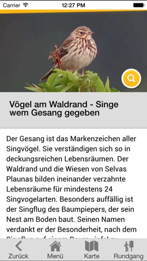 An 22 Stationen entlang der Wanderung klingelt ihr Smartphone. An diesen Stationen gibt es zu einem bestimmten Thema über die Umgebung, Natur und Tierwelt allerhand zu lesen, zu hören und zu beobachten. Entdecken Sie überraschende Zusammenhänge in der Natur, beispielsweise über ein Parfum, das leuchtet, die Gärtnerei mit 500‘000 Angestellten, über Energieriegel für Insekten, über Permafrost. Hören Sie die Geschichten «Eingemauert bei lebendigem Leib» und «Die Jungfer von Morteratsch ». Geniessen Sie unterwegs die Aussicht mit dem Fernglas und nutzen Sie die gekoppelte Schaukel. Steigen Sie ein in das Vogelnest auf neun Metern Höhe.
