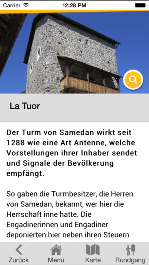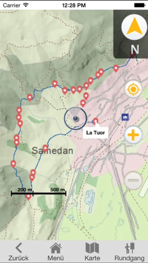 Der Weg ist mit Steinen markiert. Die Wanderzeit beträgt ungefähr 2.5 Stunden. Sie können an verschiedenen Orten starten, den Rundgang aber auch jederzeit unterbrechen. Sind Ton und GPS eingeschaltet, erscheinen die Informationen an den entsprechenden Standorten von selbst. Mit Hilfe der Karte lassen sich die Informationspunkte aber auch selber suchen.