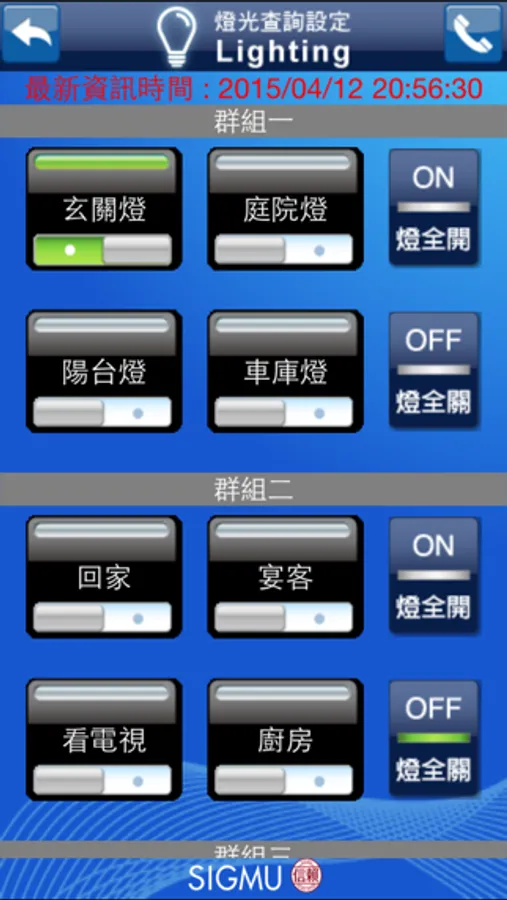 透過手機或行動裝置,即時遠端操控家中各區域燈光之設定與燈光狀態。