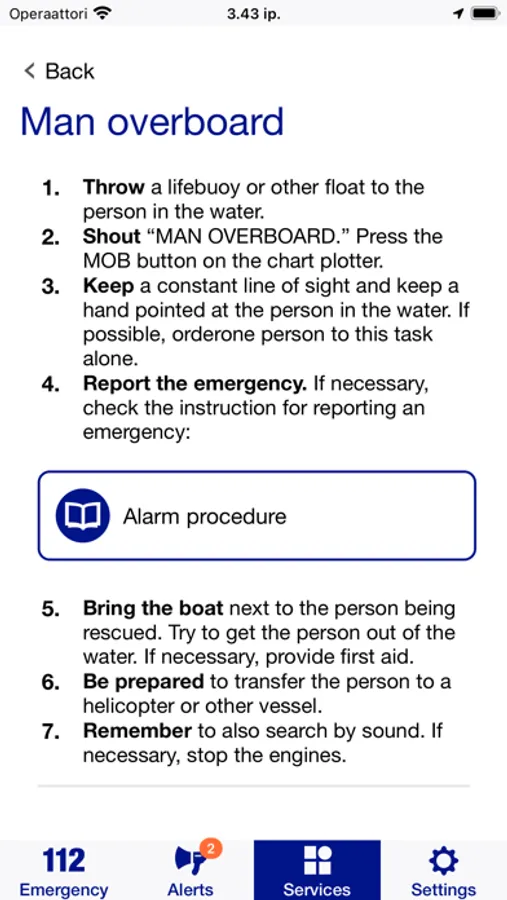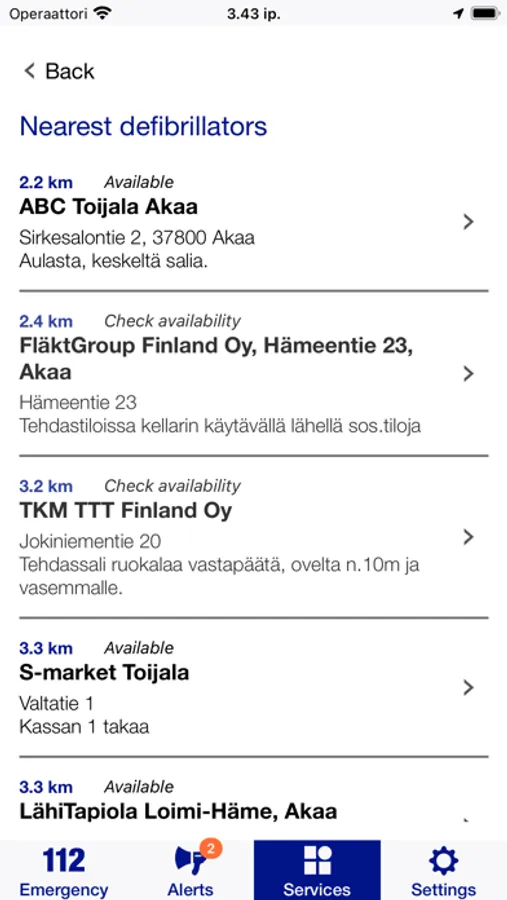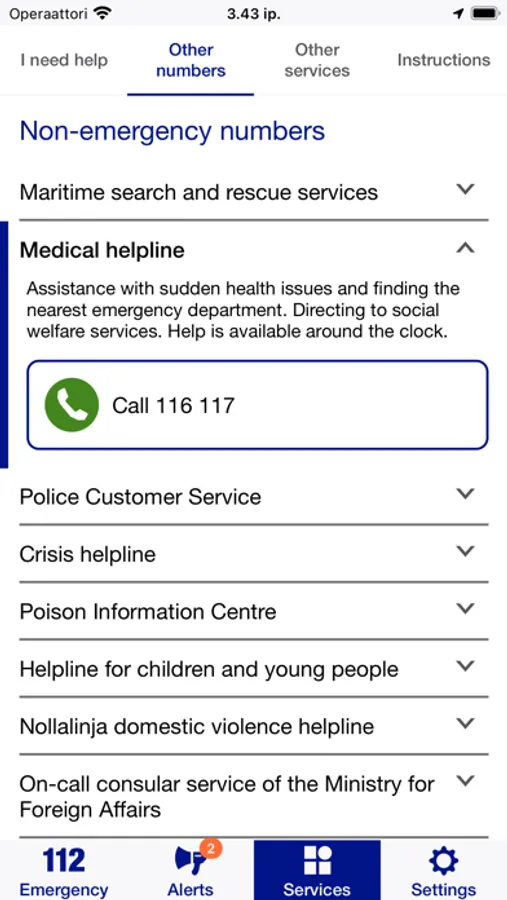 The app includes hotlines for non-urgent situations. It also allows you to check the location of the nearest defibrillator and make a travel registration informing the Ministry of Foreign Affairs that you are travelling abroad.