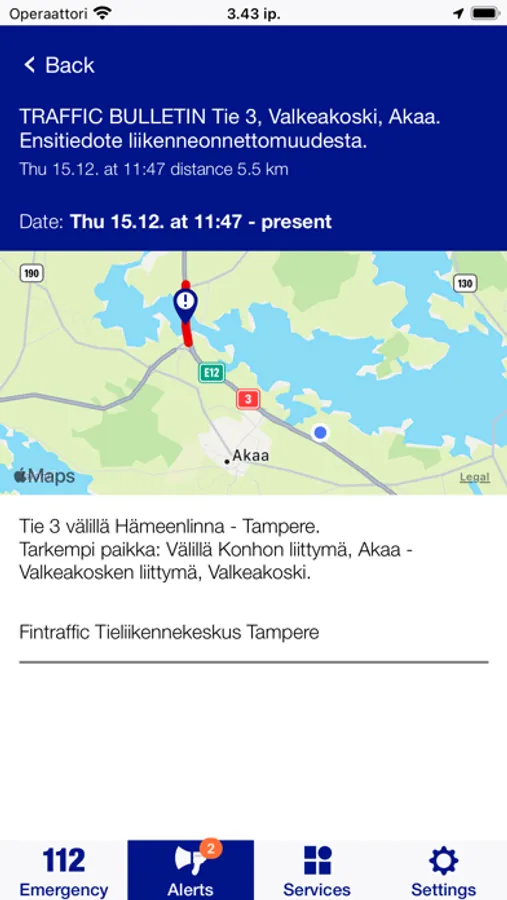 The 112 Suomi mobile application is one of the statutory channels for public warnings. The app provides you with regional public safety alerts and notices based on the location of your phone. The public safety alerts are written and issued by the relevant authorities.