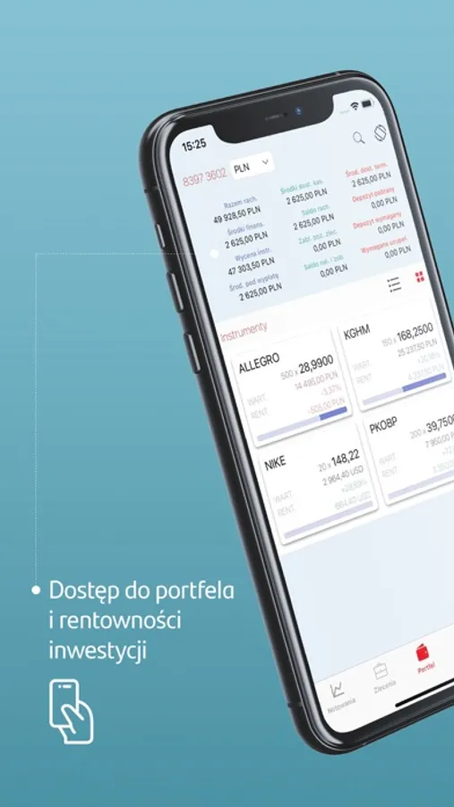 - prezentacja instrumentów dla poszczególnych rachunków w postaci kafelków lub tabeli,