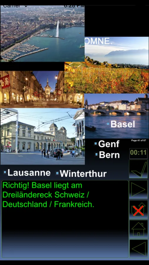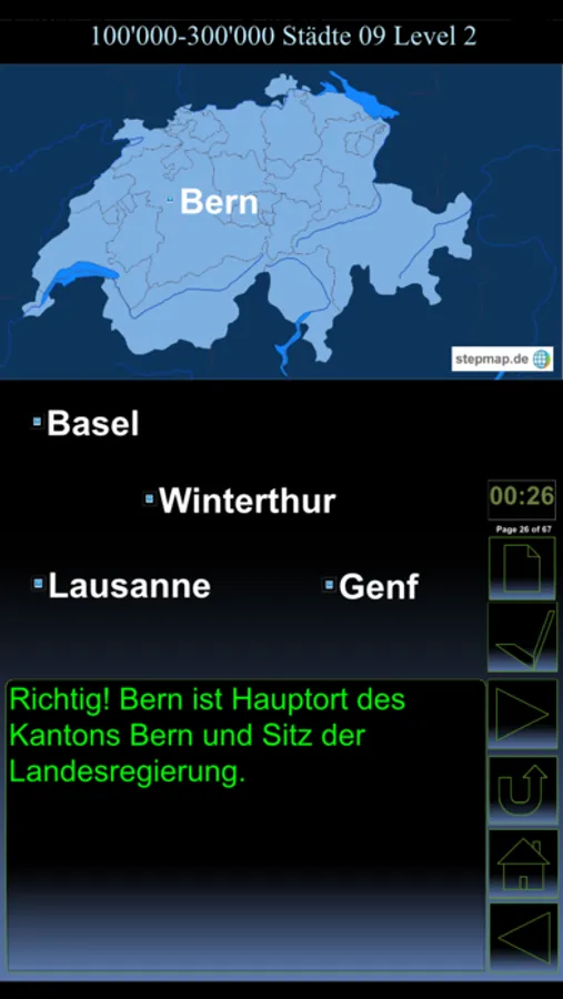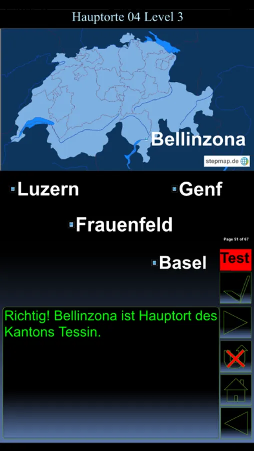 Das Programm wurde von einem Reallehrer entwickelt. Es wird nicht einfach vorhandenes Wissen abgefragt, du lernst alles von Grund auf, es braucht keine Vorkenntnisse, nach dem Grundsatz: „Vom Einfachen zum Schweren.“ Im ersten Level schiebst du Schilder mit den Namen der Städte auf vorgegebene Punkte. Du erhältst laufend Feedback und kannst innerhalb der zur Verfügung gestellten Zeit noch korrigieren, wenn du die Lösung nicht auf Anhieb gefunden hast. Du lernst also durch Probieren. Du kannst auch mehrmals die Spicktaste betätigen, da wird kurz die Lösung eingeblendet. Wenn du es trotzdem nicht geschafft hast, kannst du einmal die Wiederholungstaste betätigen. Bei jedem richtigen Zug bekommst du 2 Punkte. Im Level 2 schiebst du die Schilder der Städte ohne vorgegebene Ortspunkte ungefähr an die richtige Stelle. Du bekommst für jeden richtigen Zug drei Punkte. Spass macht es Postkarten der Städte zu erraten. Du schiebst Schilder auf die entsprechenden Karten. Hier ist auch korrigieren innerhalb der vorgegebenen Zeit erlaubt. Für jeden richtigen Zug erhältst du einen Punkt. Im Level 3 (Testmodus) bekommst du je 4 Punkte, dafür sind Spicktaste und Wiederholungstaste nicht mehr verfügbar. Auch kannst du nicht mehr die Lösung mit Pröbeln finden, jeder Zug muss auf Anhieb stimmen und kann nicht mehr korrigiert werden. Die Zeit ist nicht mehr begrenzt.