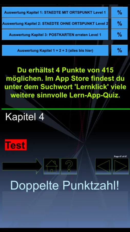 Idealerweise arbeitest du einfach von vorne nach hinten. Du kannst aber auch einzelne Kapitel im Inhaltsverzeichnis auswählen und erhältst eine Auswertung nur für das gelöste Kapitel in Punkten oder in Prozent. Das Ganze ist ein gutes Gehirnjogging und Gedächtnistraining das erst noch Kindern, Jugendlichen und Erwachsenen Spass macht. Die Inhalte werden dir auf der kognitiven und der motorischen Ebene vermittelt. Zum Lernen brauchst du keine Internetverbindung.