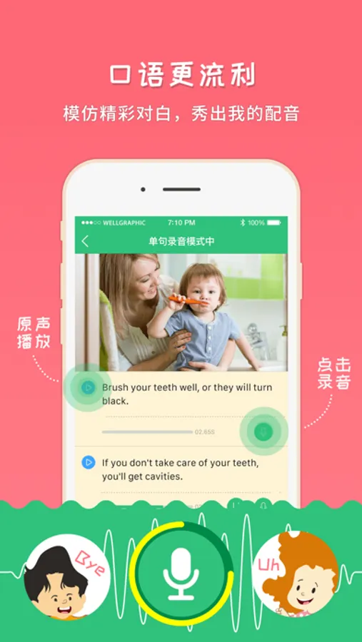 1.情境复读:图片+文字方式展现,可以逐句点读、复读,在情境故事中学习。
