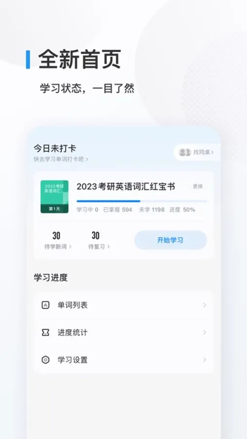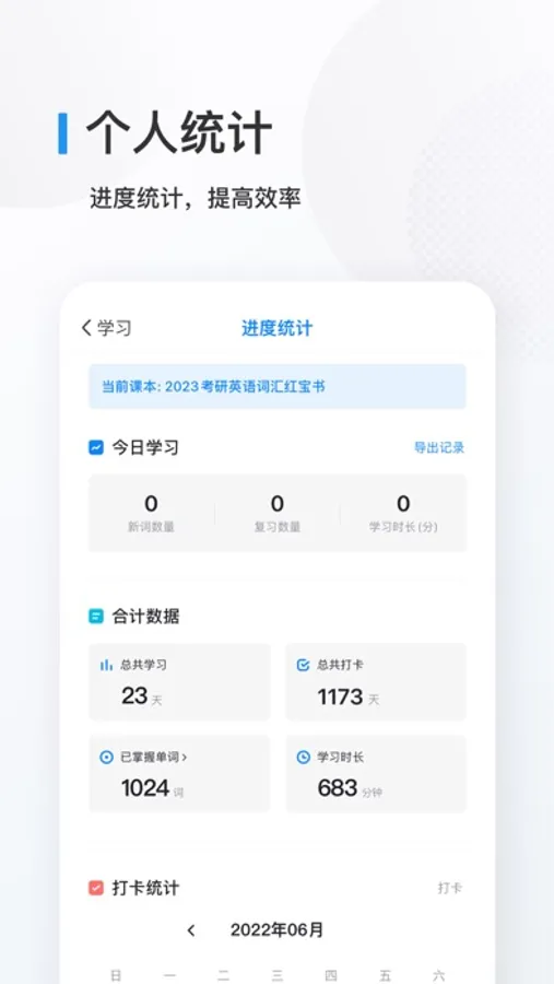 软件内以图表的形式记录了你每天背单词的情况:打卡日历、日期统计、学习进度、单词学习统计,四种图表,实时更新,助你轻松浏览学习数据、清晰把握背单词进度,学习进步看得见。