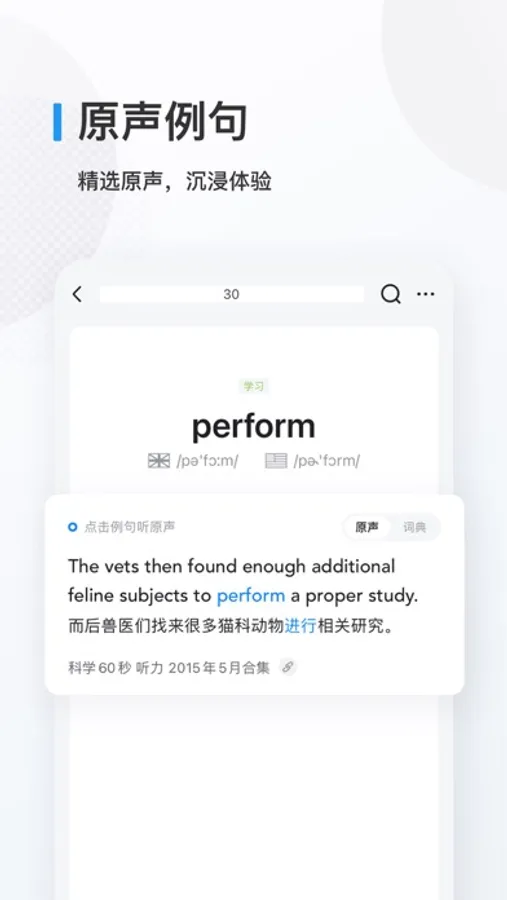 收录《每日英语听力》中的海量原声例句,内容出自你喜欢的电影、美剧,或是 BBC、CNN、经济学人等专业新闻,助你了解单词的真实单词语境,专业高效地记忆单词。