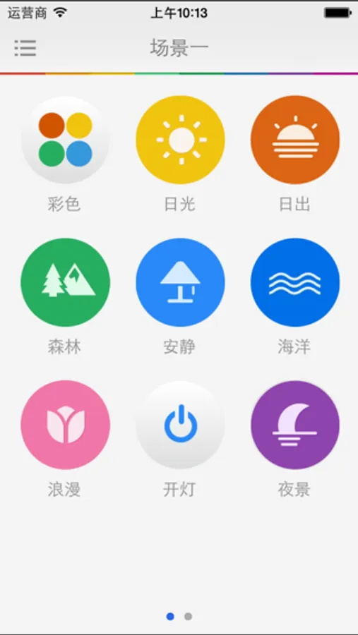有彩色 日光 日出 森林 安静 海洋 浪漫 夜景8个场景供选择,灯光根据场景属性变换颜色。