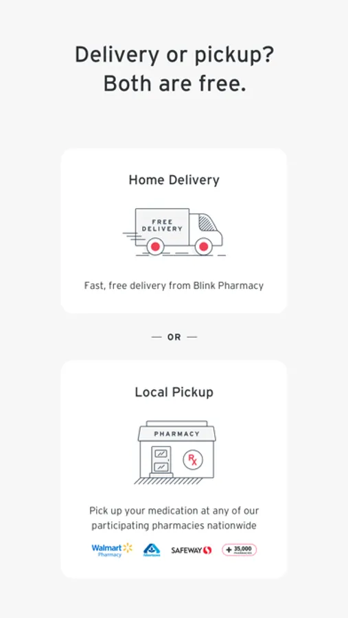 Blink is free to use and is accepted at 35,000 US pharmacies, including major chains like Walmart, Kroger, Costco, Safeway, Albertsons, Osco, Harris Teeter, Smith’s, Giant and many more. Most neighborhood drug stores also accept Blink. Or have your medication delivered free.