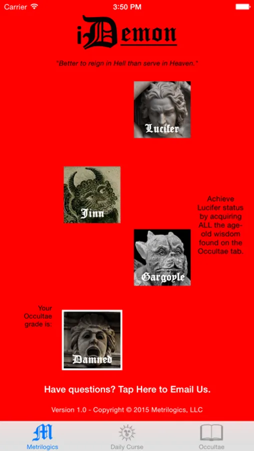 It is said that there can be no Good without Evil - and we couldn't agree more. That's why we're proud to offer the iDemon app - the companion to our iAngel app. Each glimpse into iDemon's 'Daily Curse' tab reveals secrets into the World of Darkness - including key dates throughout history involving those who have dared to battle The Adversary, documented tales of demonic possession, quotes from scholars and authors who have studied the true nature of Evil, literary works that deal with countering - or embracing - Satanic forces, and descriptions of The Fallen themselves.
