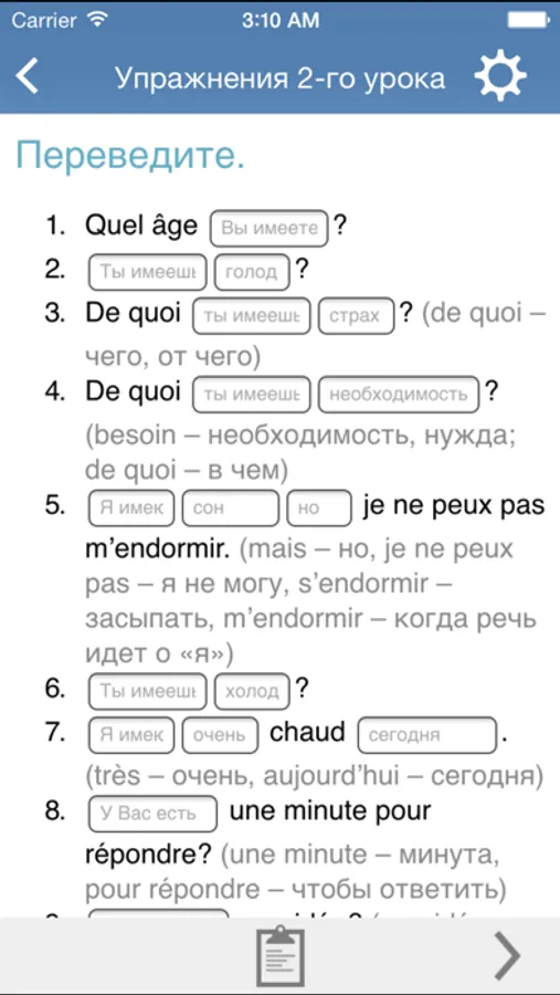 В наших упражнениях нужно самому сделать перевод всего предложения. Всегда можете свериться с ответами. 80% слов Вы найдете либо в теории урока, либо в предыдущих упражнениях, так что заглядывать в словарь на каждом слове совершенно необязательно. И запоминание слов происходит на практике, когда Вы самостоятельно строите фразы и предложения.