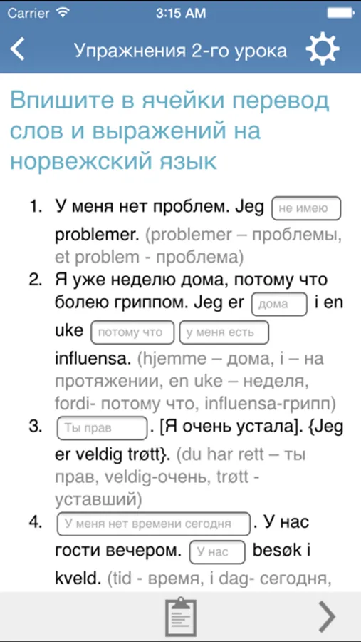 В наших упражнениях нужно самому сделать перевод всего предложения. Вы всегда можете свериться с ответами. 80% слов Вы найдете либо в теории урока, либо в предыдущих упражнениях, так что заглядывать в словарь на каждом слове совершенно необязательно. И запоминание слов происходит на практике, когда Вы самостоятельно строите фразы и предложения.