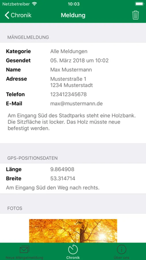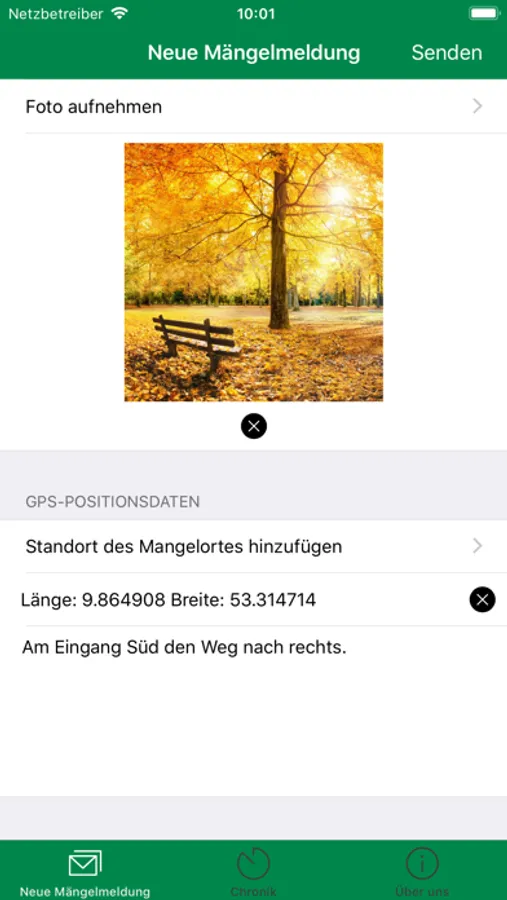 - bei Bedarf Foto und die aktuellen GPS-Positionsdaten hinzufügen