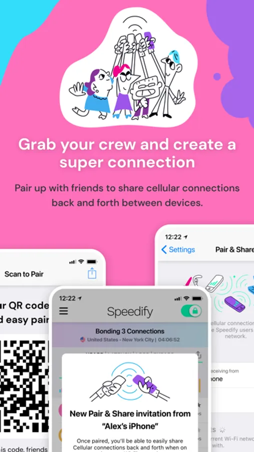 With Pair & Share you can easily share cellular connections between multiple Speedify users on the same Wi-Fi network. That means more stable connections on the road, at conferences and concerts, or while livestreaming. Grab your crew and create a super connection!