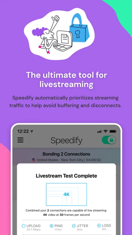 We use the accelerated encryption from Apple's processors to deliver a fast, secure connection. Speedify runs behind the scenes, encrypting the data transmitted for ALL of your apps, so you stay safe whether you're browsing, shopping, or livestreaming.