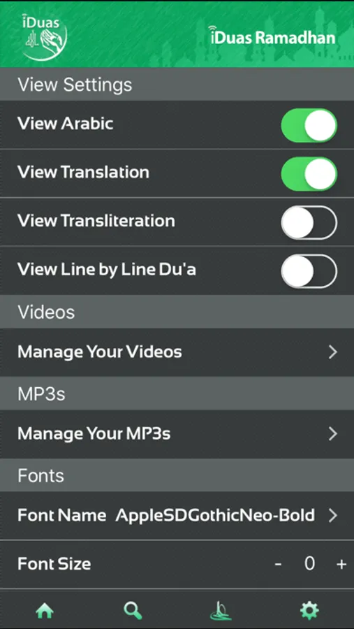 - Can customize the app using the settings (i.e. View Arabic, Transliteration, font size, and more)