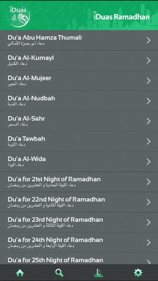 The application contains a detailed guide on what to do for the Month of Ramadhan and contains supplications and salutations that are highly recommended to be recited during the Holy Month of Ramadhan including the Nights of Power (Laylatul Qadr) and Eid-ul-Fitr. A special feature includes the ability to download MP3s and Video files for each Du'a/Amaal and following along while reciting or listening.