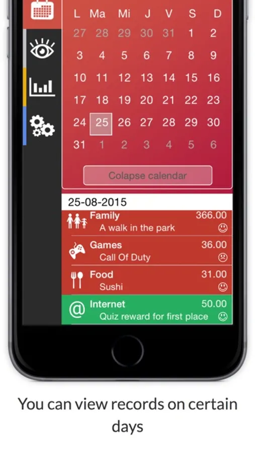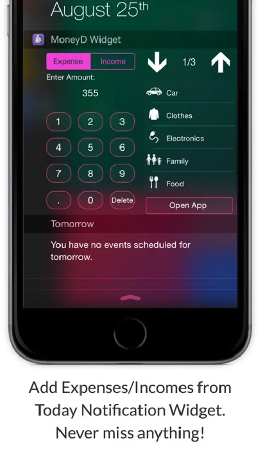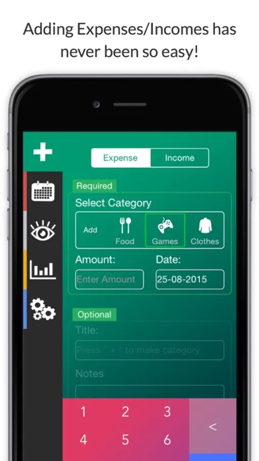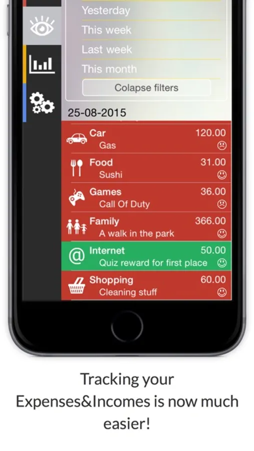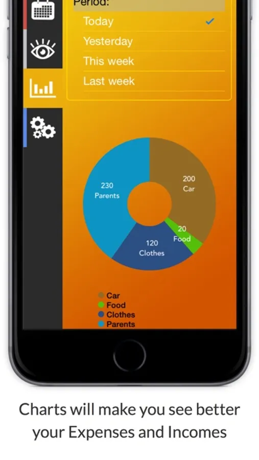 You can track your Expenses or Incomes by viewing them either by day or by period and other filters. Charts are also available either for categories or Expenses/Incomes inside that category and they're ready to change your perspective in viewing them. Adding an Expense or Income was also made to be fast and easy to use but it also provides some optional parameters of you want do add more details only. It takes only about 2 seconds to add an one and from now you don't even have to enter inside the application to do than because of our Today Notification Widget. You will have now no excuse for not tracking them!