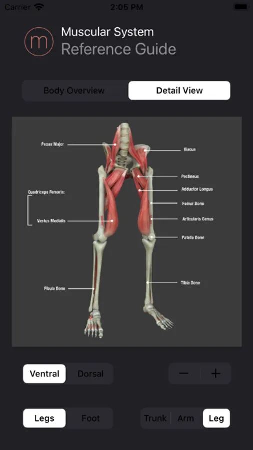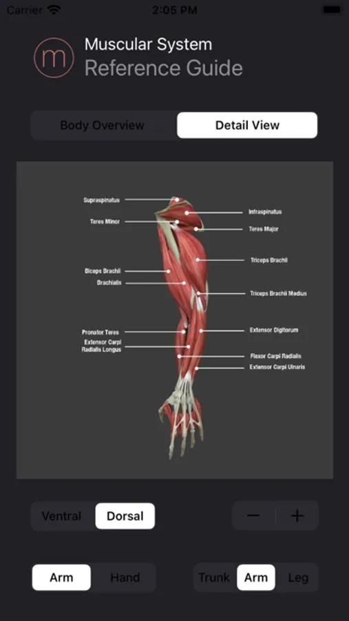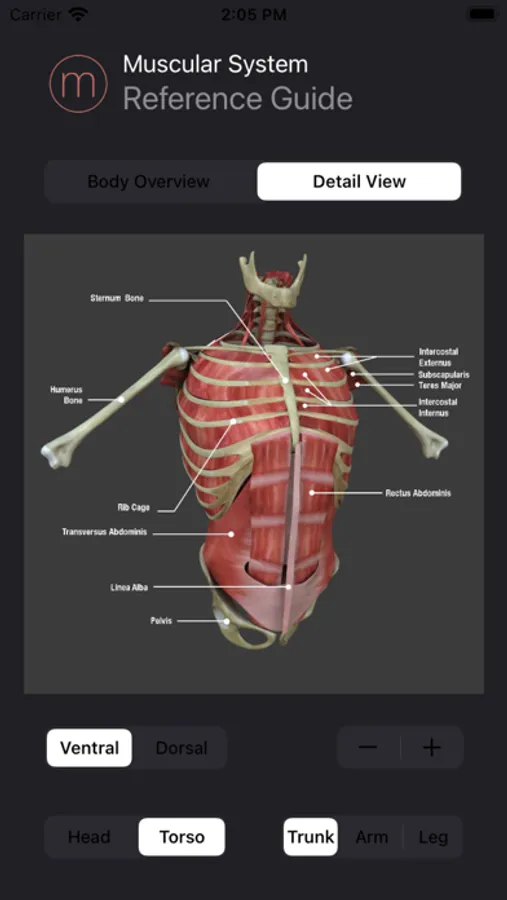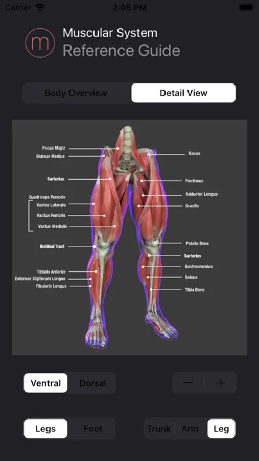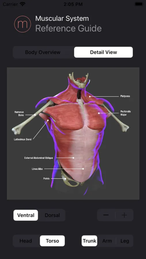 A clear guide to human musculoskeletal system. See beautifully illustrated muscles from all major body regions. Rotate a full 360 degrees to see muscles from all angles. All regions have 8 layers of detailed muscle clearly labelled.
