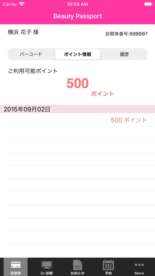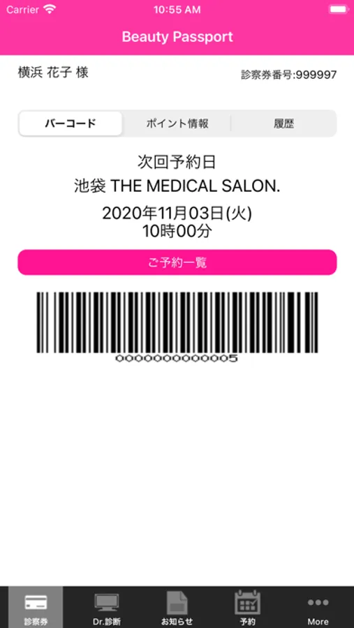 診察券に代わり、アプリに表示されたバーコードをかざすことによるチェックイン機能、次回予定日時や履歴、