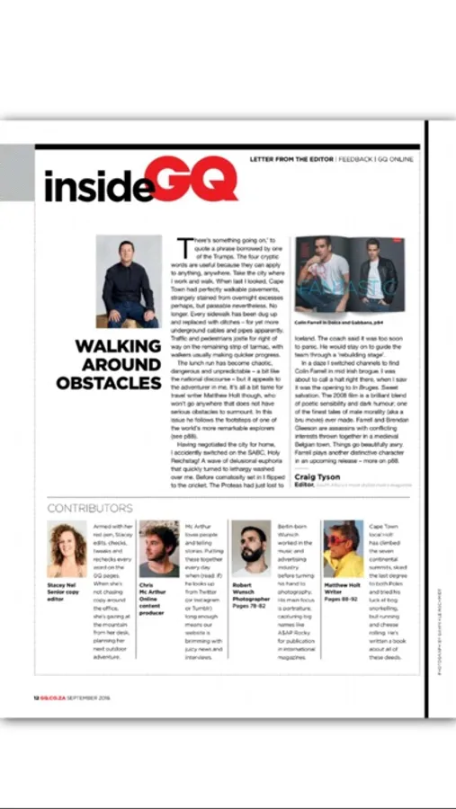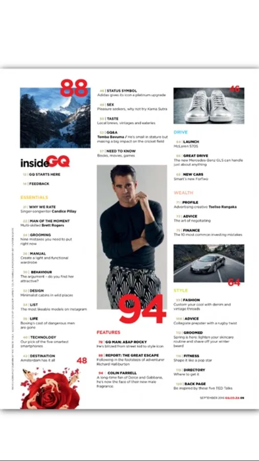 GQ South Africa is the first and last word on men's style. With access to some of the world's top photographers and writers, GQ offers professional men content that is entertaining and enlightening. Whether it's fashion, tech, business, Hollywood or investigative journalism, GQ covers it all with intelligence and imagination.