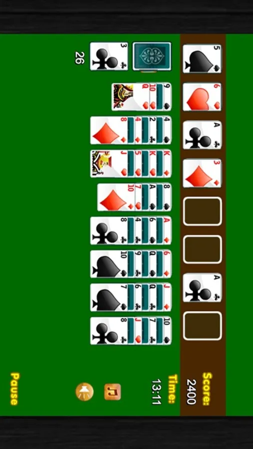 SoliJoy is a great solitaire card game played with two standard packs of 52 cards, each of them with two colors, spades (black), hearts (red), diamonds (red) and clubs (black). The game starts, and the cards are shuffled and are put over several piles on the tableau. After that, there are several piles on the tableau containing these cards. The remaining cards that are not part of the tableau are placed in a remaining pile. The object of the game is to put all 104 cards into 8 goal piles through a number of allowed moves.