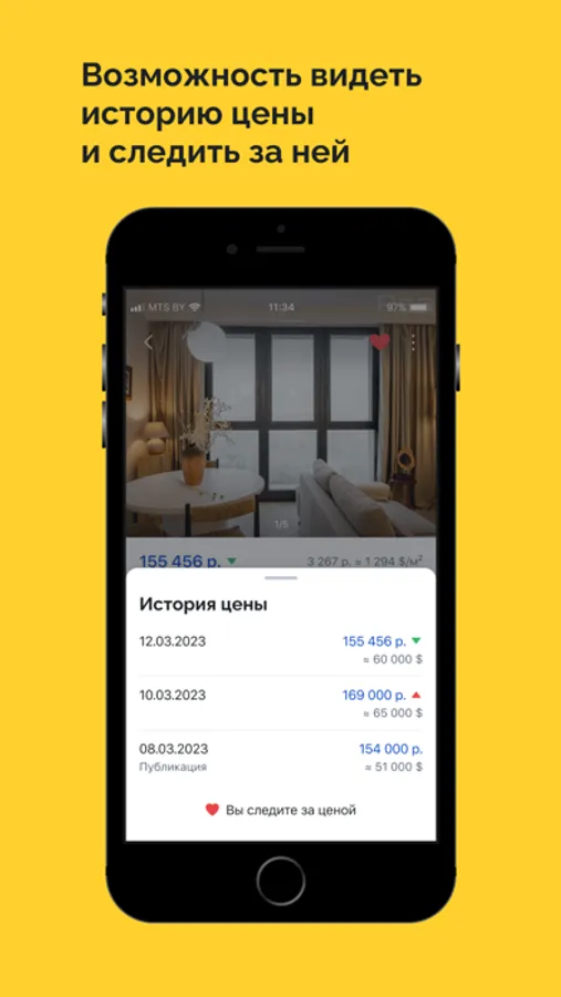 • Следите за историей цен по каждому объекту и индикаторами изменения цены (выросла/уменьшилась цена).